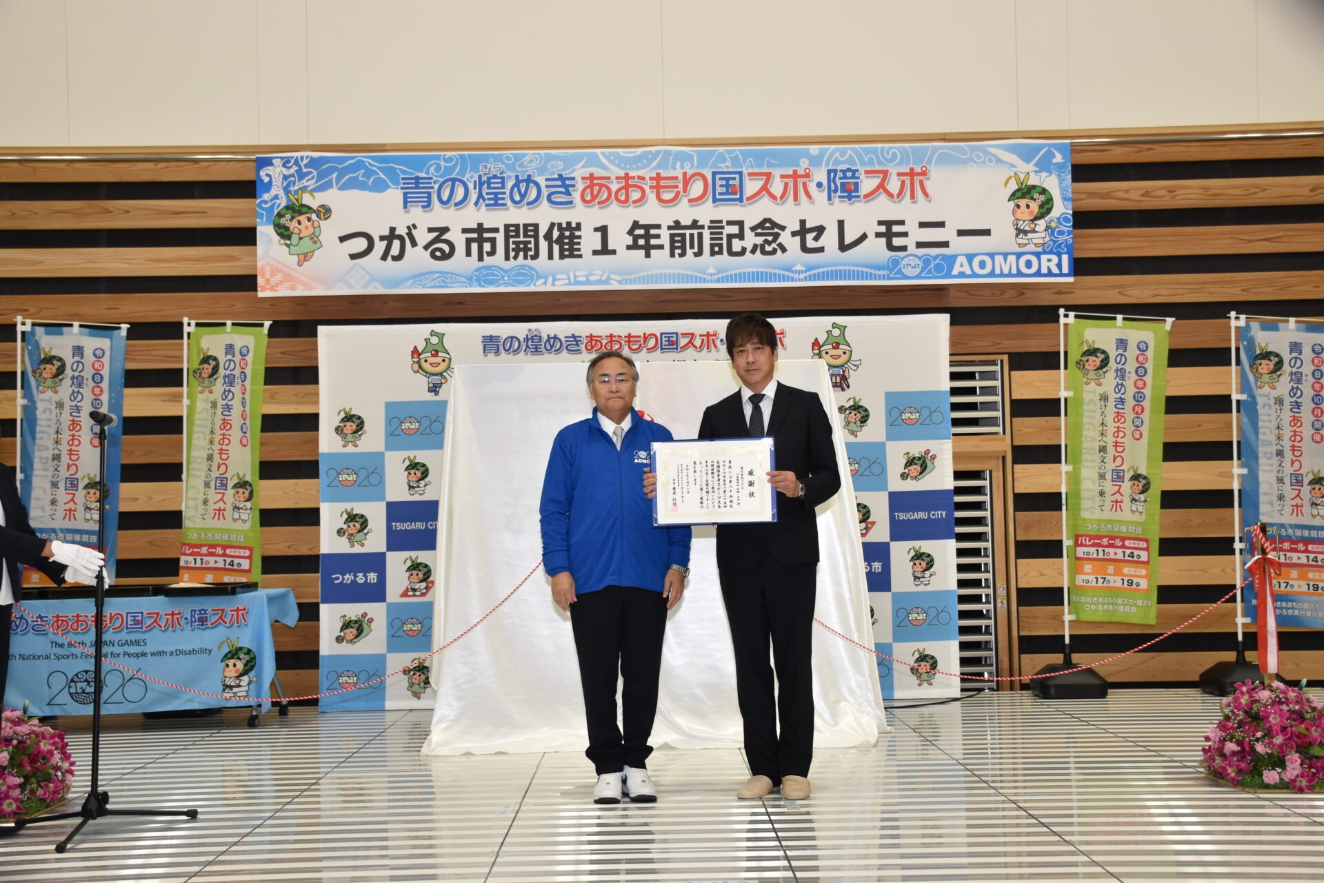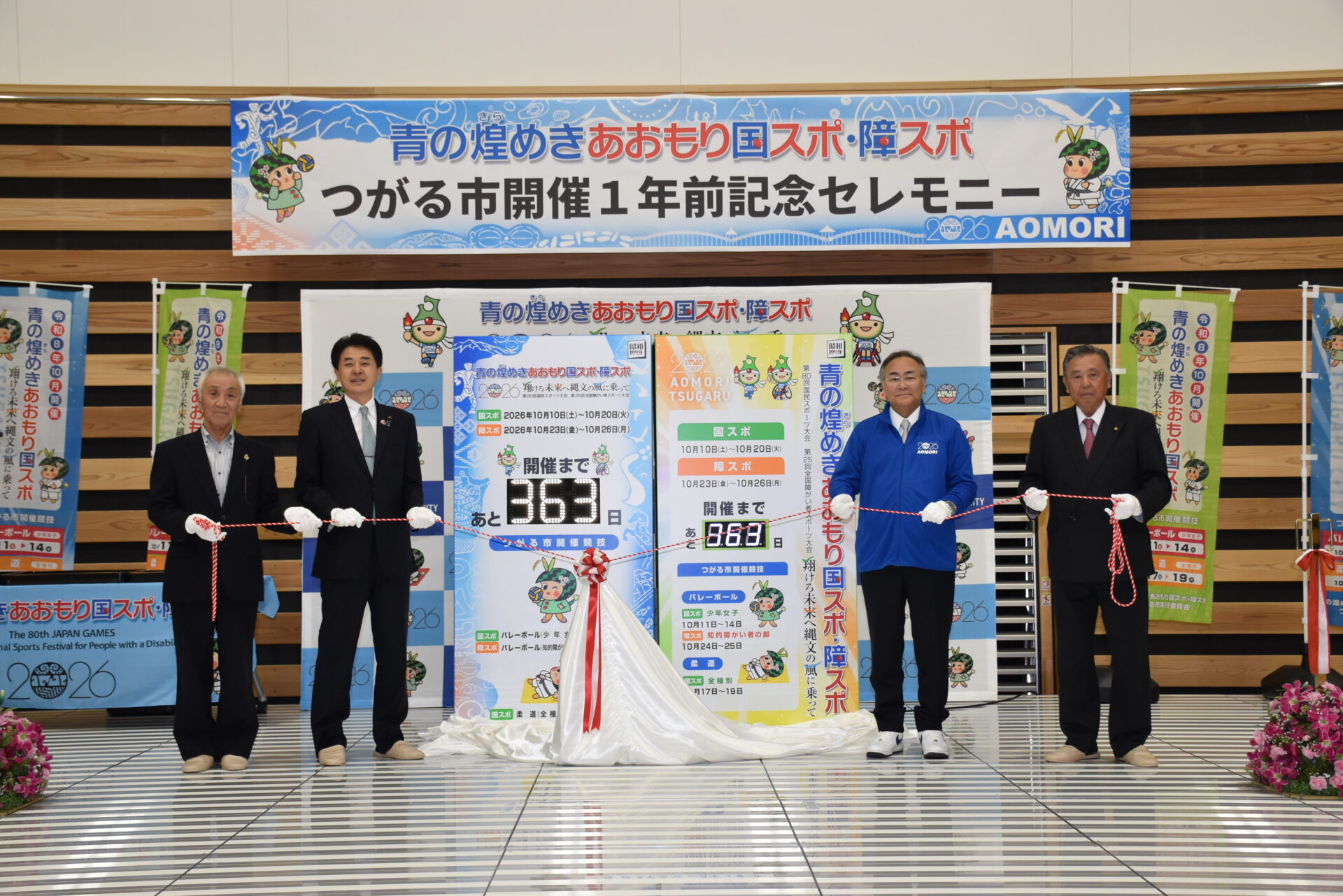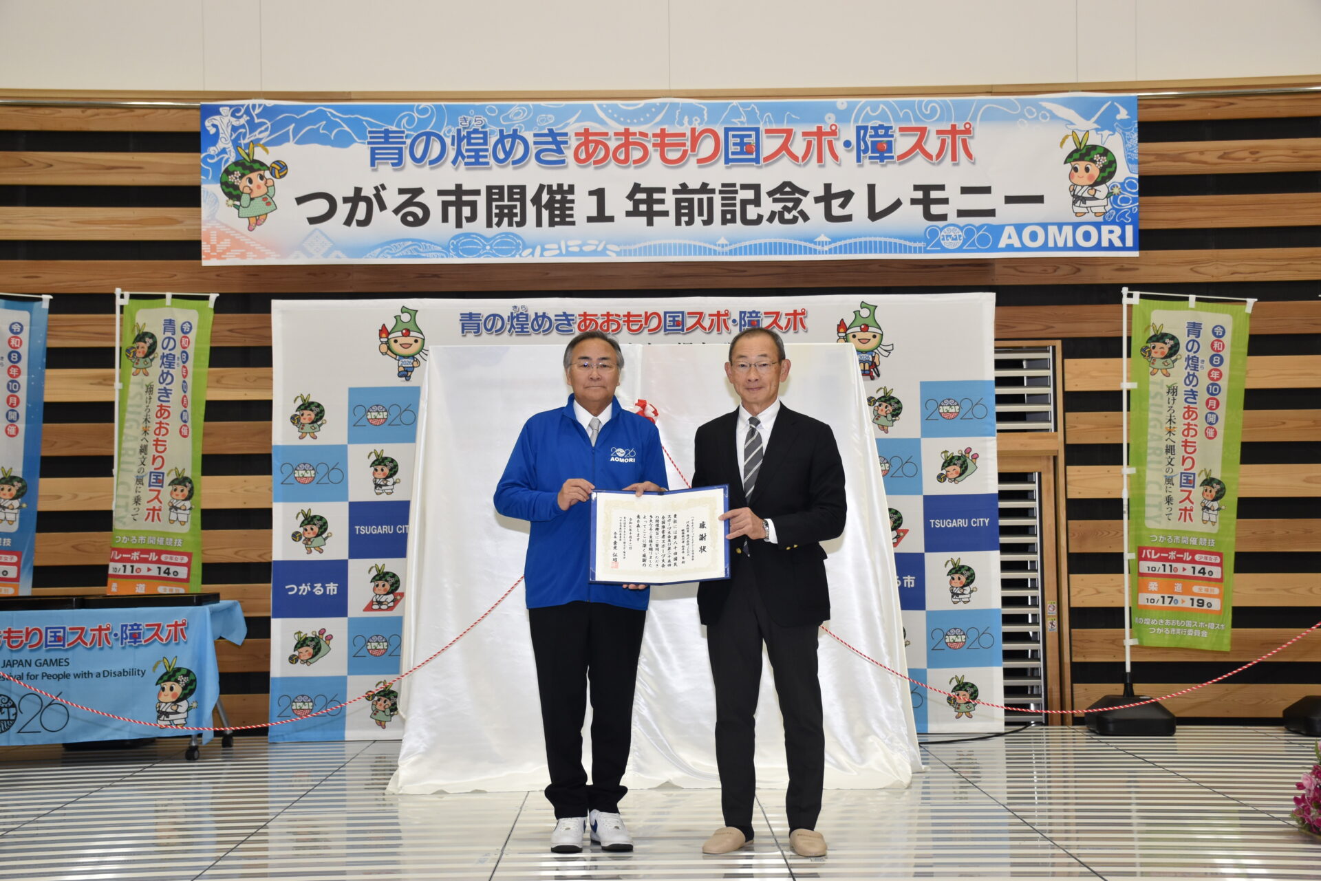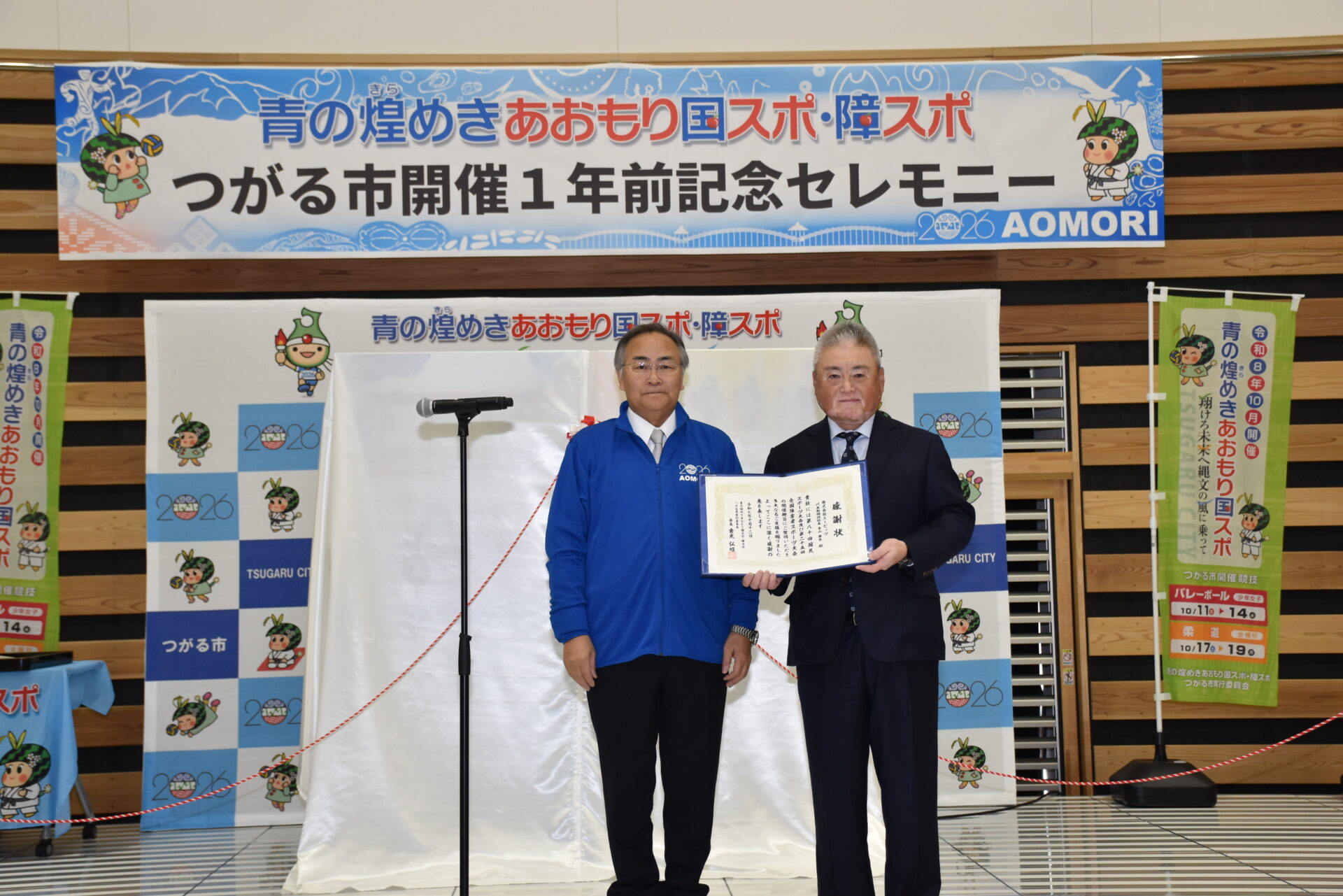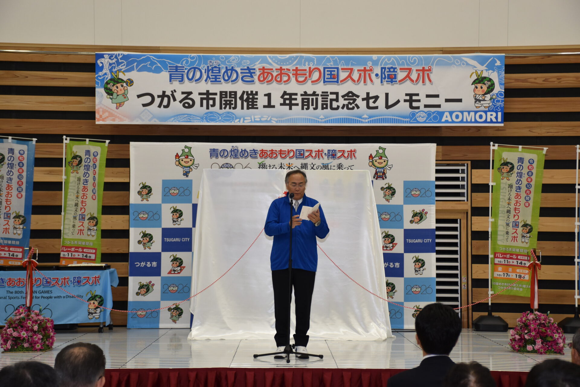 10月12日(日)、青の煌めきあおもり国スポ・障スポつがる市開催1年前記念セレモニーを開催しました。協賛企業感謝状贈呈式やカウントダウンボード除幕式、もりた保育園・車力中学校の皆さんによる青の煌めきダンス披露を行いました。 ~市長挨拶~ ~感謝状贈呈式 株式会社エービッツ~ ~感謝状贈呈式 株式会社プラス~ ~感謝状贈呈式 つがるオフショアエナジー合同会社~ ~カウントダウンボード除幕式~ ~青の煌めきダンスを披露するもりた保育園児~ ~つがる吹奏楽団の演奏とともに青の煌めきダンスを披露する車力中生徒~ ~イメージソング「翔けろ未来へ」を演奏するつがる吹奏楽団の皆さん~