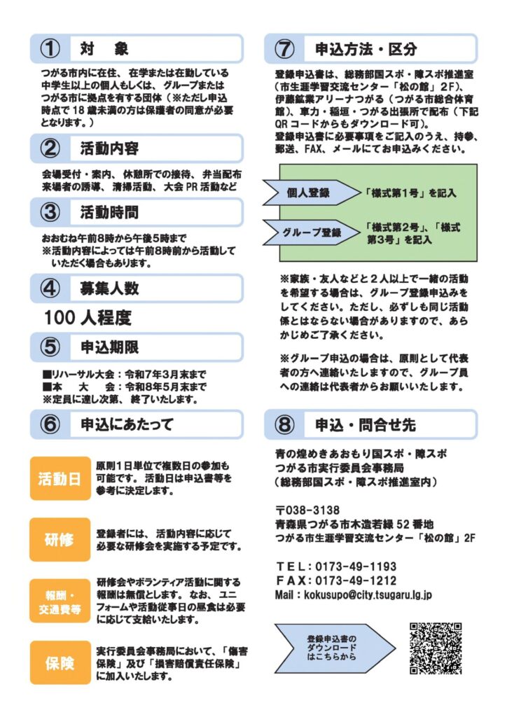 また、登録申込書は、国スポ・障スポ推進室(松の館2階)、伊藤鉱業アリーナつがる(つがる市総合体育館)、車力・稲垣・つがる出張所でも配布しています。