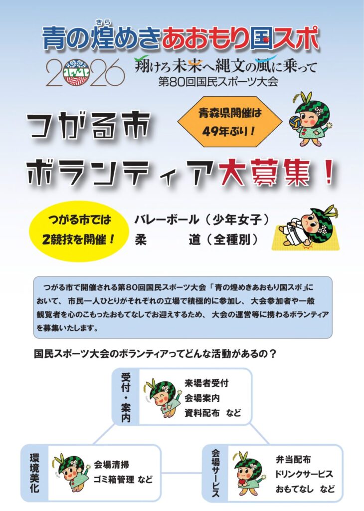つがる市で開催される第80回国民スポーツ大会「青の煌めきあおもり国スポ」において、運営等に携わるボランティアを募集します。